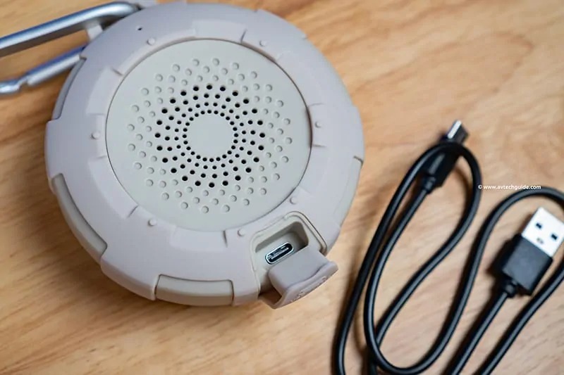 นอกจากนั้นยังซ่อนพอร์ต USB-C สำหรับชาร์จไฟ (รองรับการชาร์จเร็ว) เอาไว้ด้านล่างอย่างมิดชิดโดยมีฝาปิดอย่างดี เพื่อกันน้ำและฝุ่นละออง เพราะว่าลำโพงรุ่นนี้ออกแบบให้กันน้ำและฝุ่นได้ตามมาตรฐาน IP68 ทั้งยังออกแบบให้สามารถลอยน้ำ (floatable) ได้ด้วย คืออารมณ์ลอยไปฟังเพลงไปสไตล์ปาร์ตี้ริมสระน้ำนั่นแหละครับ