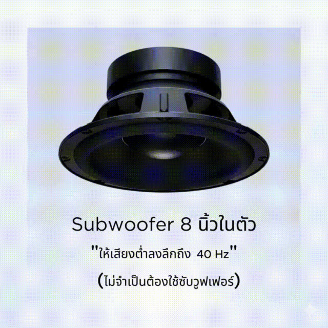 Integrated 8” woofer extends down to 40 Hz—no subs needed